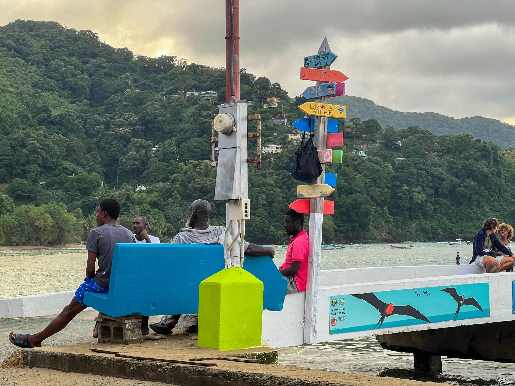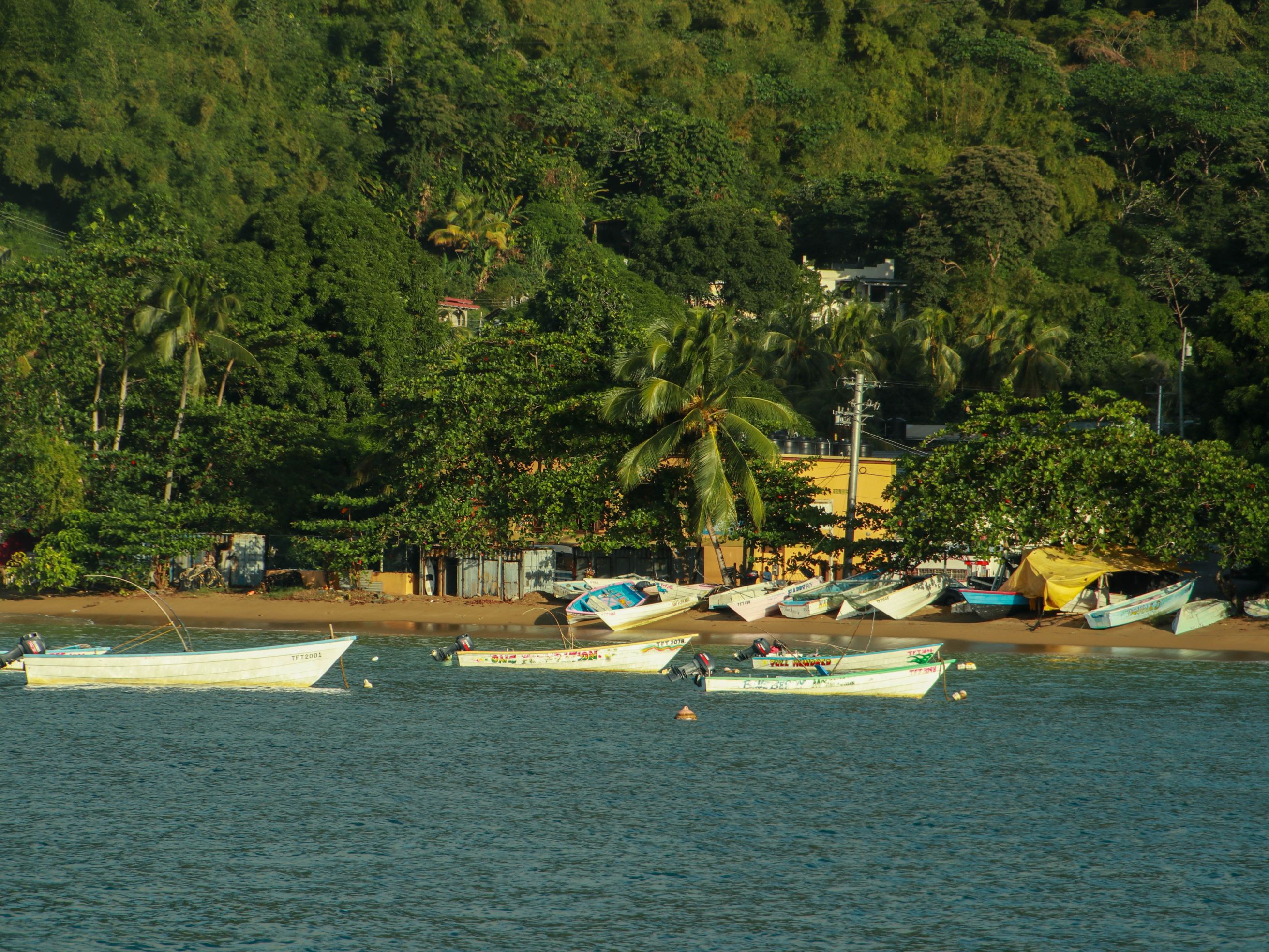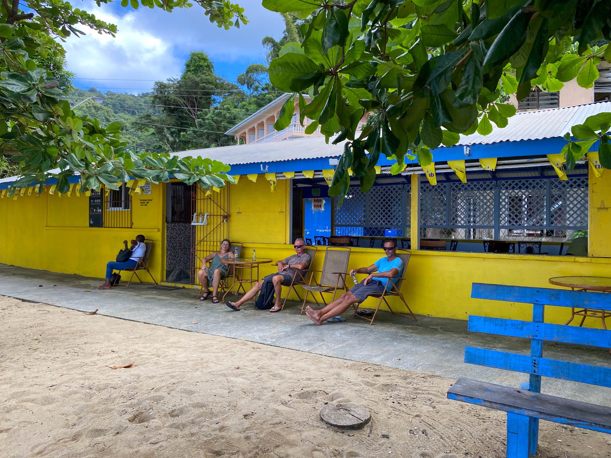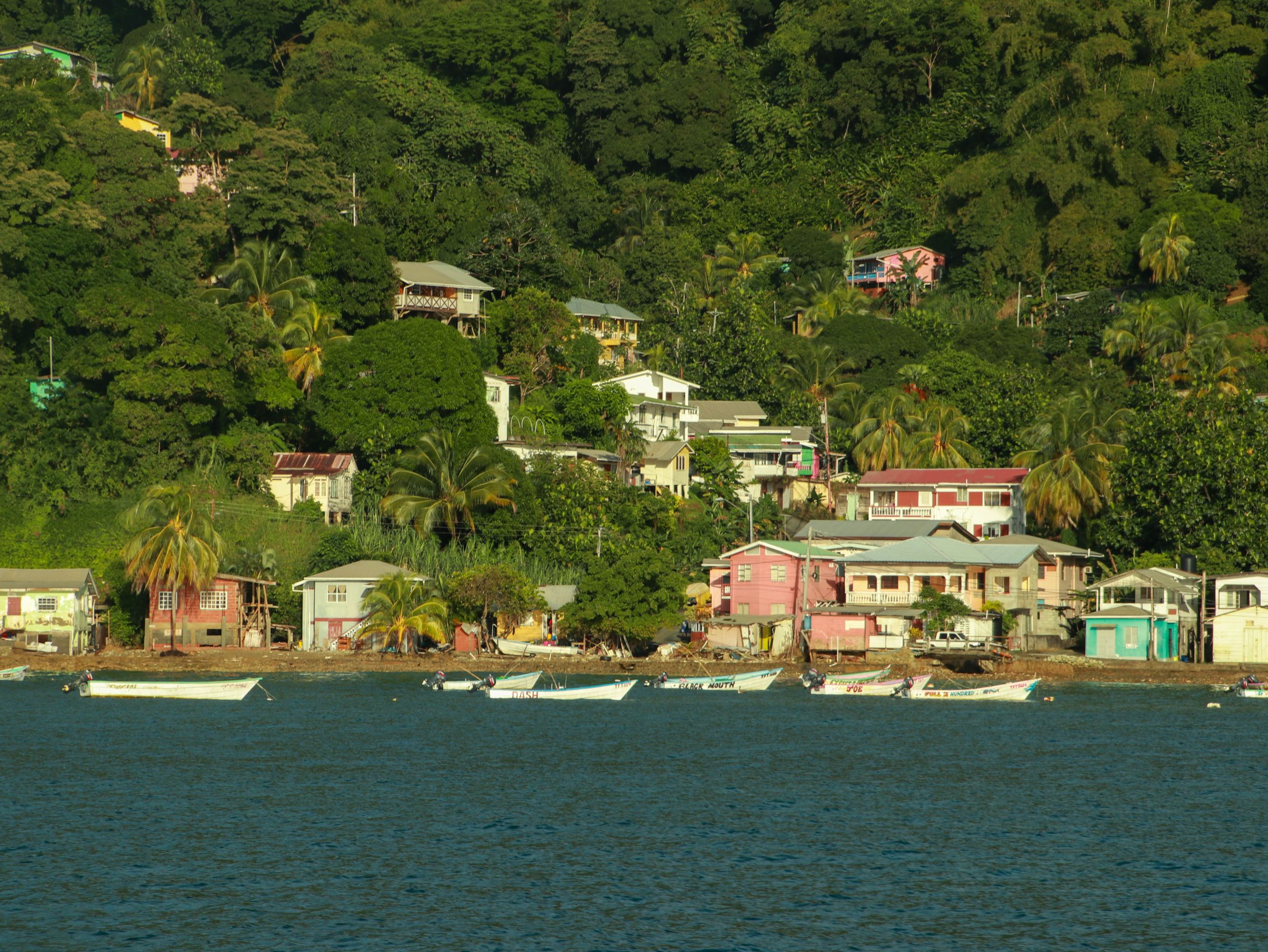 Wir liegen mit unserem Boot im Nordwesten der kleinen Insel (12 km breit, 41 km lang, 61 000 Einwohner) in der Man O`War-Bucht direkt vor Charlotteville. Charlotteville ist ein kleines, sehr ursprüngliches Fischerdorf. Den Straßenrand säumen kleine Häuser und Hütten. Die Leute (überwiegend Männer) lungern so`n bisschen rum und gönnen sich auch mal ein Bierchen (oder auch anderes). Alles läuft sehr geruhsam und entspannt ab. Die Menschen sind supernett und grüßen uns immer total offen und freundlich, ohne aufdringlich zu sein. Gleich hinter den Buden ist ein schmaler feinsandigen Strand. Dort und an den Mooringtonnen im Wasser liegen viel kleine Fischerboote, die offenbar auch intensiv genutzt werden. Die meisten Einheimischen verdienen ihren Lebensunterhalt durch die Fischerei, handeln mit Waren (Lebensmittel o.ä.) oder arbeiten für die Regierung. So hat man uns das jedenfalls erzählt.